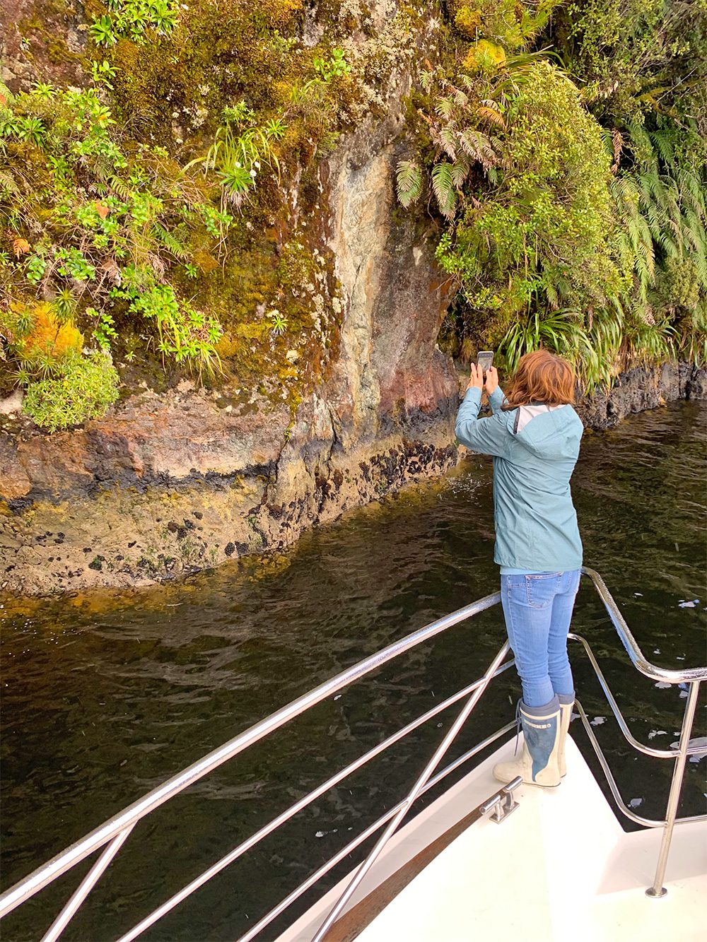 From there we made our way quietly up through the very slender Acheron Passage feeling very small on 300m deep water looking up at the grandeur of the 450m tall sheer cliff faces, above which rose 1000m mountain peaks. As we cruised we saw that Dusky Sound now overflowed with stunning waterfalls, cascading through the forests and falling from every cliff into the sea. The lush cliffs of Acheron were especially beautiful, covered almost completely with verdant moss out of which grew soft ferns and the rare Alpine Daisy. Driving the boat by remote control from up on the foredeck allowed us to get right up to the cliffs for a close look.