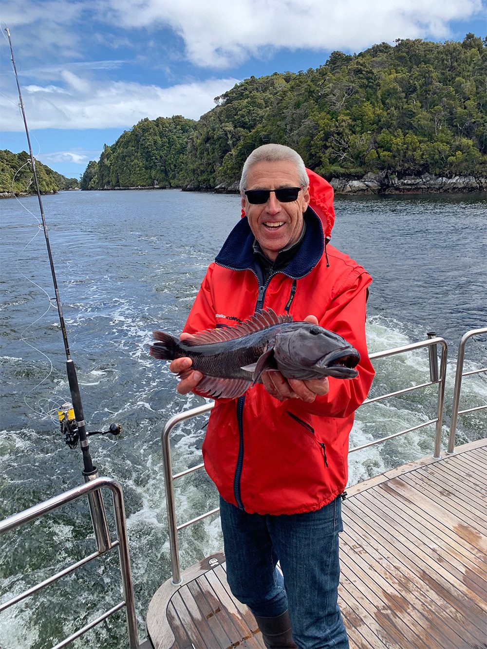After spending the night in Supper Cove we took the extremely narrow and deep passage – in places only 50 meters wide but 260 meters deep! – between the southern side of Long Island and the cliffs out towards the entrance of the sound and Anchor Island. On the edge of the open ocean we picked up Hapuka in a quick spot of fishing, then meandered our way through the myriad of small islands – the aptly named Seal Islands and Many Islands – encountering pods of playful fur seals before anchoring in Luncheon Cove. Tendering ashore, we went for a walk through the beautiful native bush, where we were thrilled to see a Kākāpō wandering casually across the track. Kākāpō live only on three remote offshore islands in the world – one of which is Anchor Island – due to being critically endangered, on the brink of extinction. There are only 213 Kakapo alive today.