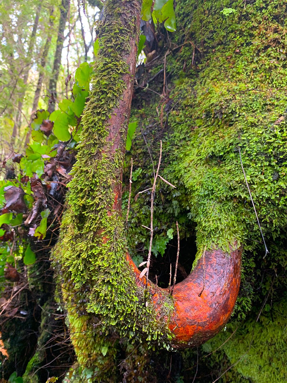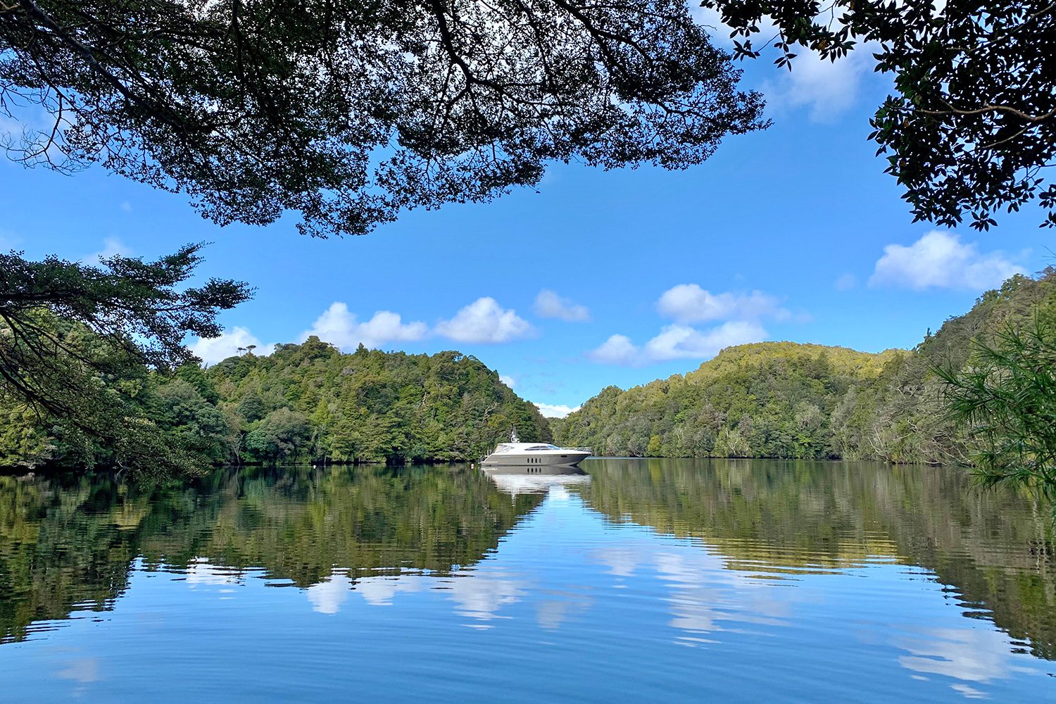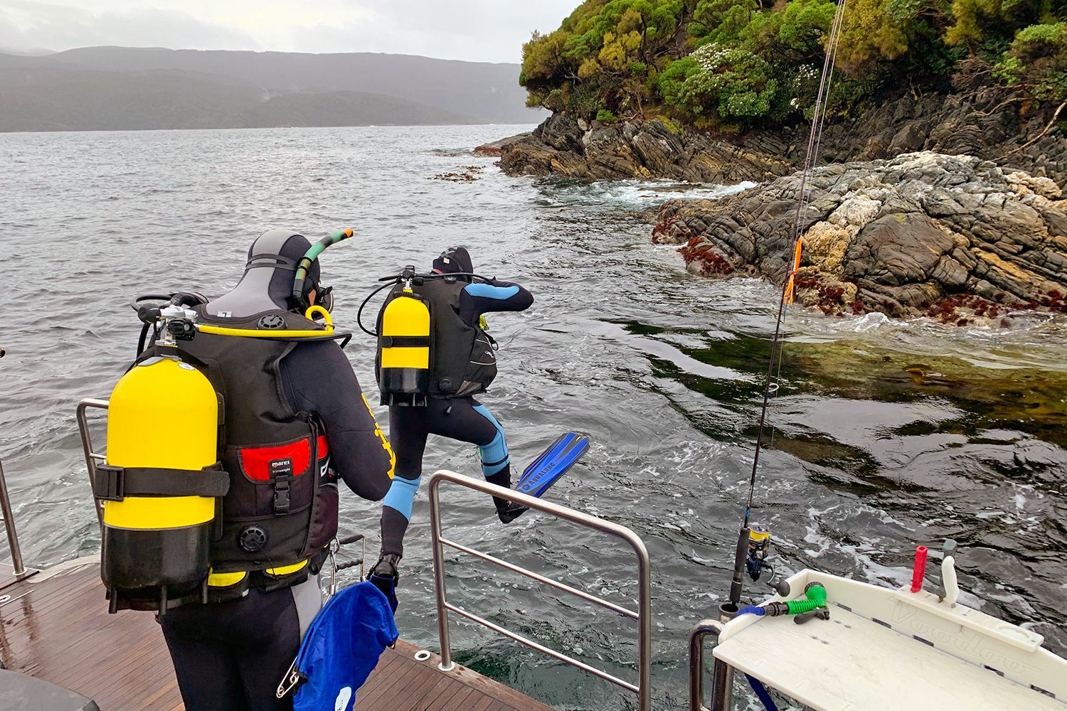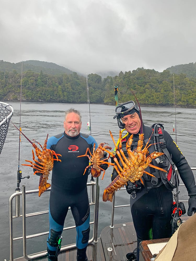 We stayed in Luncheon Cove for the rest of the day drift-fishing and diving as the big blue cod were plentiful. In the evening we shared a beautiful meal of crispy skin Hapuka on a romanesco sauce accompanied by an exceptional Greywacke Wild Sauvignon Blanc. The next morning Craig and our fishing expert Darryl dived the cold waters around the Passage islands for crayfish, that were found walking proudly above striking trees of black and red coral usually only found on deep water continental slopes. From there we headed through the needle thin entrance into Sportsman Cove to spend the night. The tea coloured water in the cove was so reflective and still it completely hid the line between sky and sea, perfectly mirroring the tall Beech and Rimu forest and blue sky. At low tide the glassy water line on the rocks gives a book-matched pattern which looks like the skin of some gigantic ancient reptile or Taniwha, lying dormant and undiscovered on the water’s edge.