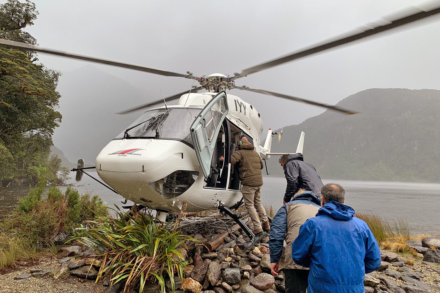 Voodoo left from Wellington, travelling down the length of the east coast of the South Island, to Invercargill. From Invercargill she explored rugged Stuart Island and then powered across to the southern coast and around into Dusky Sound (Tamatea), ready to swap crew – no ordinary experience in such a location. We had been offered by Voodoo’s owners the wonderful opportunity to take her for 9 days of exploration. The five of us were collected by a helicopter on the lakeside in Te Anau, on the other side of the mountains and near impenetrable cloud banks that isolate Fiordland from the rest of the country, and told that we had a very short window in the weather to get in. After loading up the chopper took off at speed, flying low and fast through the valleys, rising to just kiss the ridgelines where necessary to stay below the squalls and cloud cover, and the worst of the storm. Descending into the mist of Supper Cove, surrounded by tall ancient forest and waterfalls plummeting from cliffs above the clouds, the chopper skimmed low over the water to drop us on a tiny spit of beach where we met the previous Voodoo crew. A quick load up of their gear and the helicopter was off again at full speed, disappearing into the mist in seconds, to get back through the break in the weather before it closed, sealing us in this mystical place.
