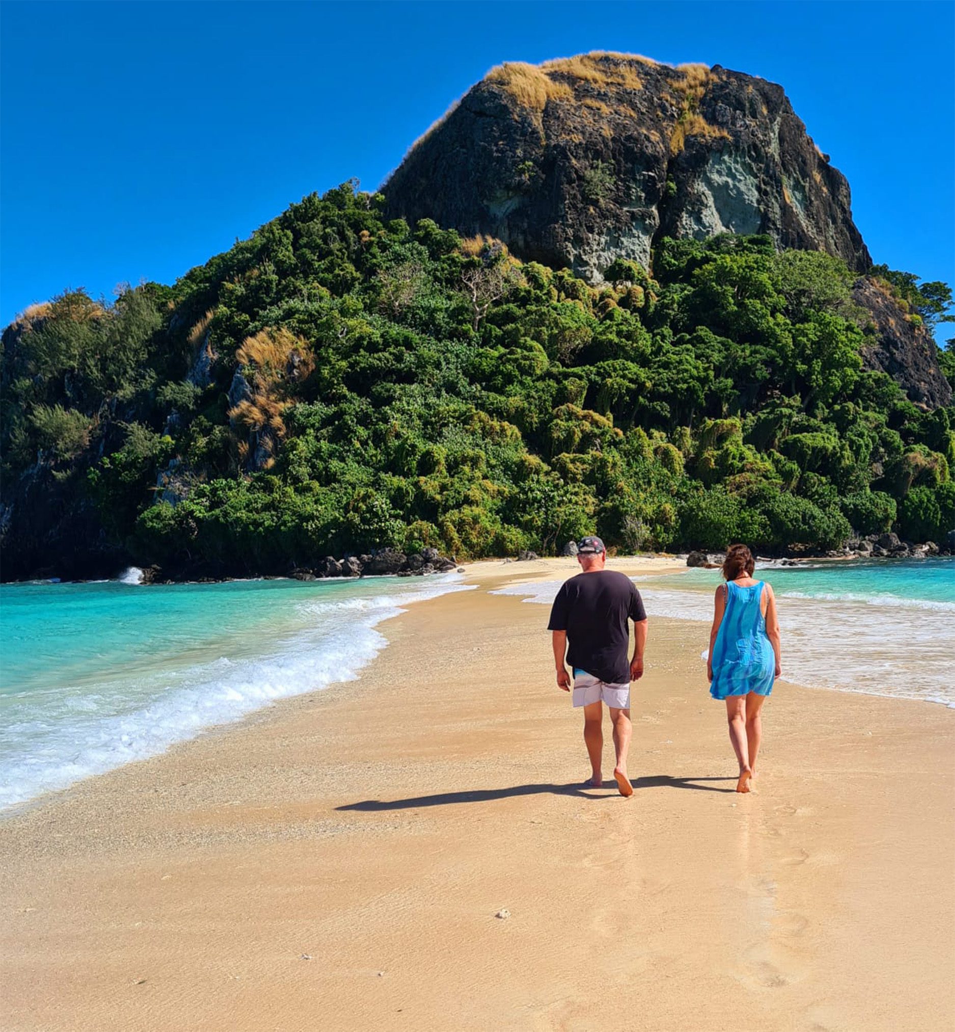 For those who felt like exploring a bit further afield, we set off one afternoon to find Lo’s Teahouse – in search of the best fresh-cooked doughnuts in the Yasawas. Following a subtle, narrow bush path across the island, we paused at the top of the hill to admire the view below: reefs glowing beneath the water, forests climbing the hills, and beaches curling like white ribbons. When we turned to continue, a small, tawny dog had appeared on the trail behind us. It looked up, gave a solemn nod, then trotted ahead. Rounding a bend just ahead of us, the dog had disappeared, and we continued alone through the long grasses. At the next fork in the path, it waited, and as we approached, nodded again, and led us onward.