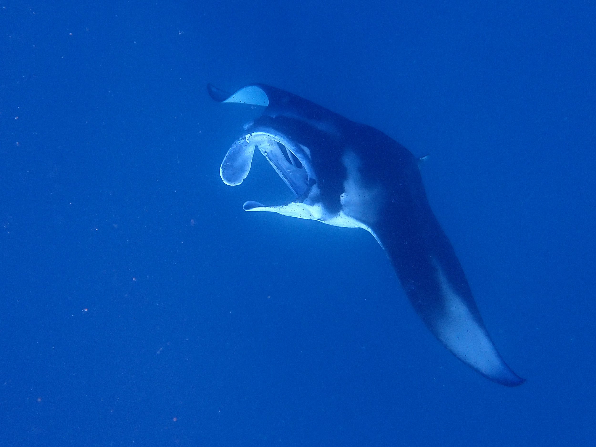Spotting the first signs near the mouth of the channel we slipped into the water and were immediately greeted with two manta spiralling beneath us – moving with a softness and grace that was almost hypnotic against the azure backdrop.