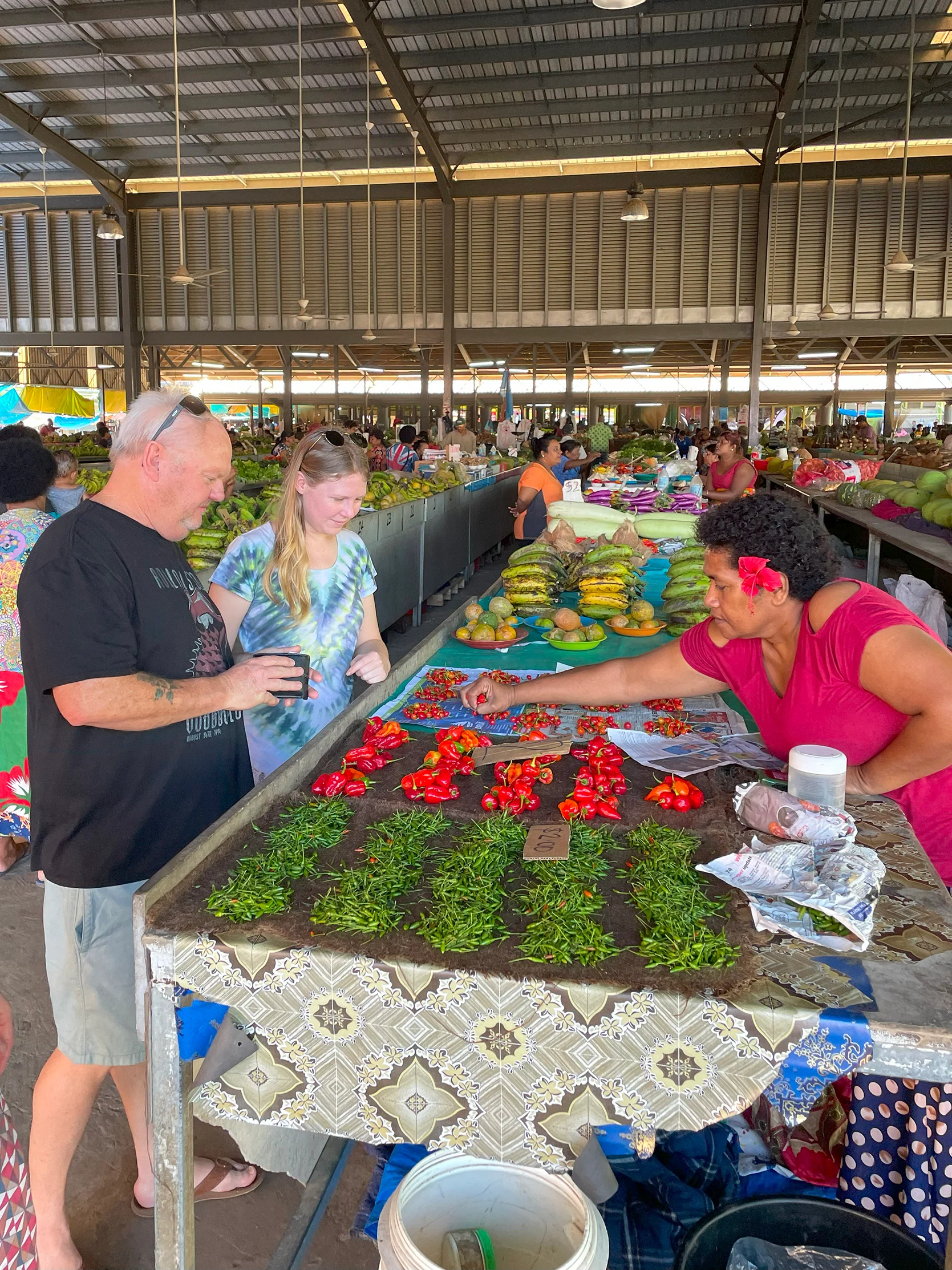 The next morning began with the surprisingly joyful task of provisioning. A visit to the local markets was a cultural experience in itself: stall after stall piled high with freshly harvested vegetables, juicy tropical fruits, fragrant herbs and spices, coconuts, chilies, and more – each handed over with a broad Fijian smile. Toward the back, the kava market makes both an interesting and important stop, to stock up on the traditional offering for local chiefs known as sevusevu. Supermarkets nearby filled in any remaining gaps with imported comforts and pantry essentials.