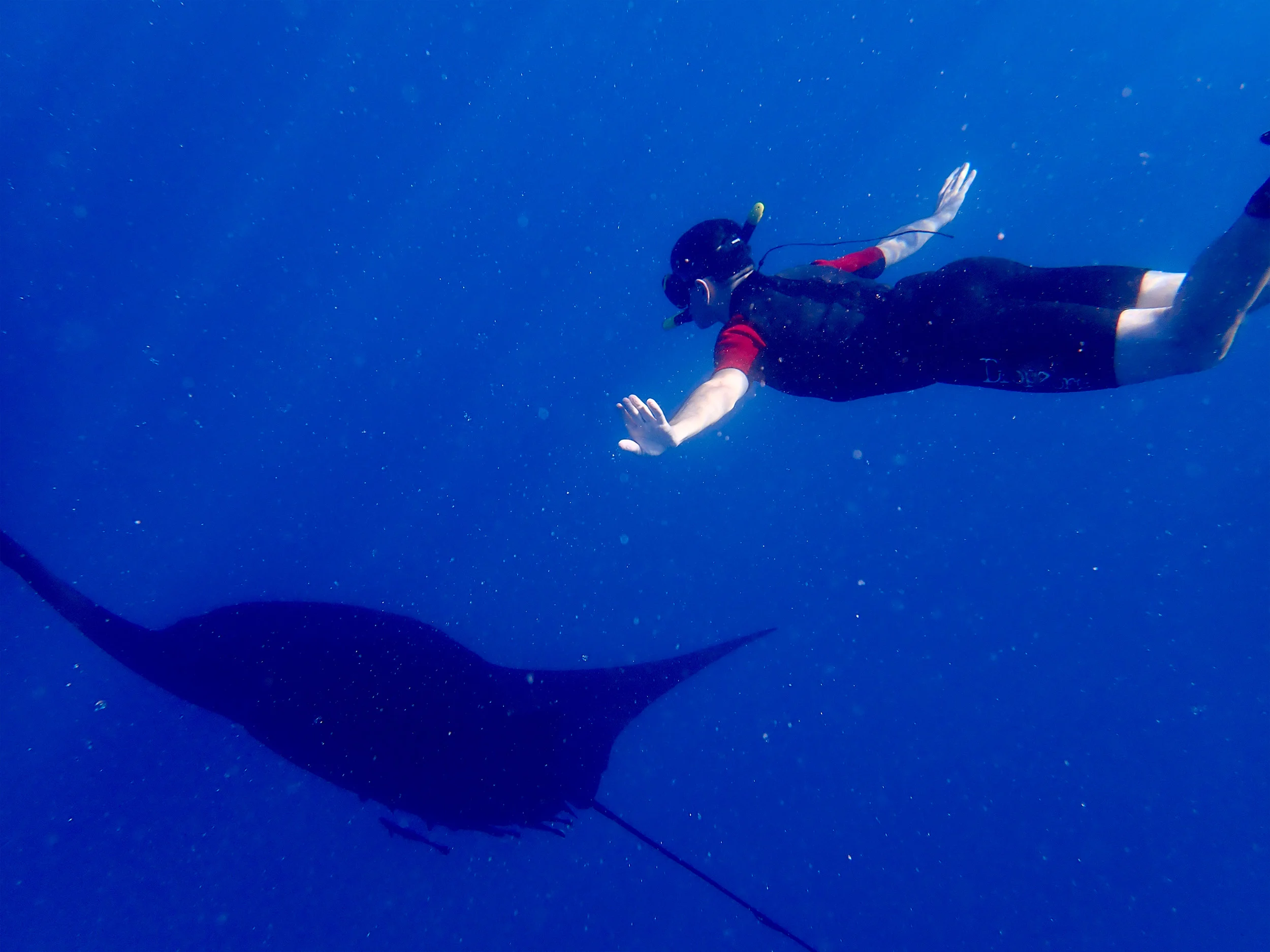 Re-entering the water we found 6 manta ray in below, including one particularly large and old manta, its scarred skin a tapestry of its long journey. We dove deep, eager to witness their twirling ballet up close, and were offered the magical opportunity to take part. Time and the world above the surface faded into insignificance as we spread our arms and flew with these gentle giants, close but not touching, sharing an unforgettable moment of harmony.