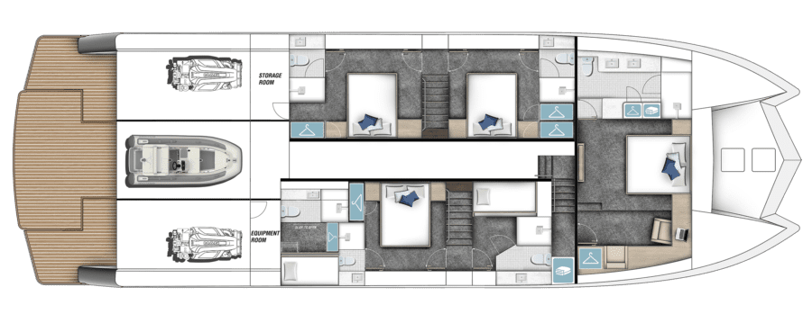 Built for every kind of lifestyle the XF85 delivers exceptional flexibility – as comfortable hosting lavish celebrations as it is embarking on remote explorations, hosting intimate family holidays or wild adventures. Its toy-carrying capacity is exceptional for a yacht of this size: a helideck capable of landing an H145 and refuelling, twin jet skis, a large tender, a full dive store, and dedicated space for every kind of board, all ready for instant adventure. Below deck, five beautifully appointed guest staterooms (including a full-beam master suite with private access) offer comfort for extended journeys, supported by dedicated crew quarters and long-range provisioning.