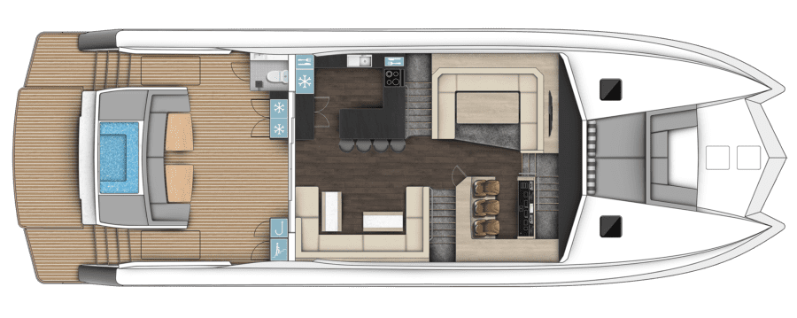 The XF85 is the ultimate expression of performance, luxury, and freedom – meticulously crafted for those who demand everything, without compromise. From its commanding, sporty silhouette to the fine craftsmanship that defines every surface, this is a yacht that turns heads while delivering substance at every level. Step aboard and you’re welcomed into a world of expansive, flowing spaces where indoor and outdoor lounging blend seamlessly. The aft deck and cockpit invite effortless entertaining, with oversized sunbeds, a generous dining space, and a large hot tub that connects the social heart of the boat.